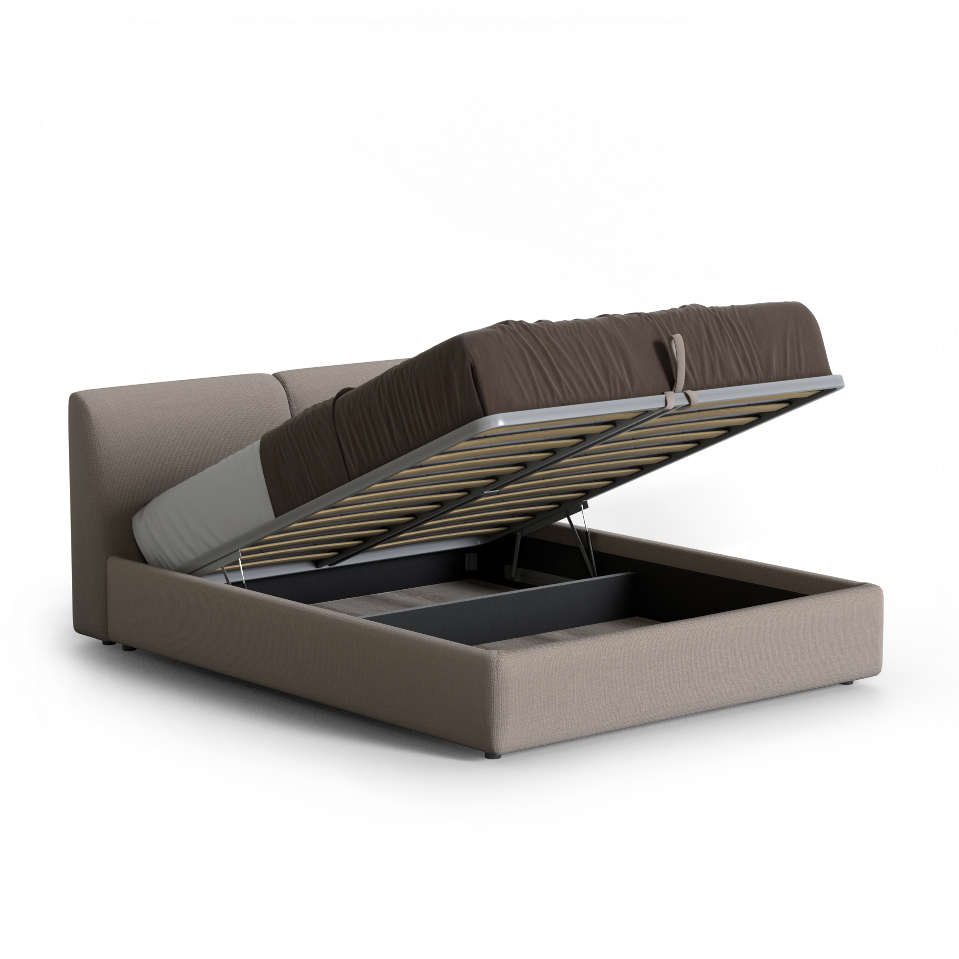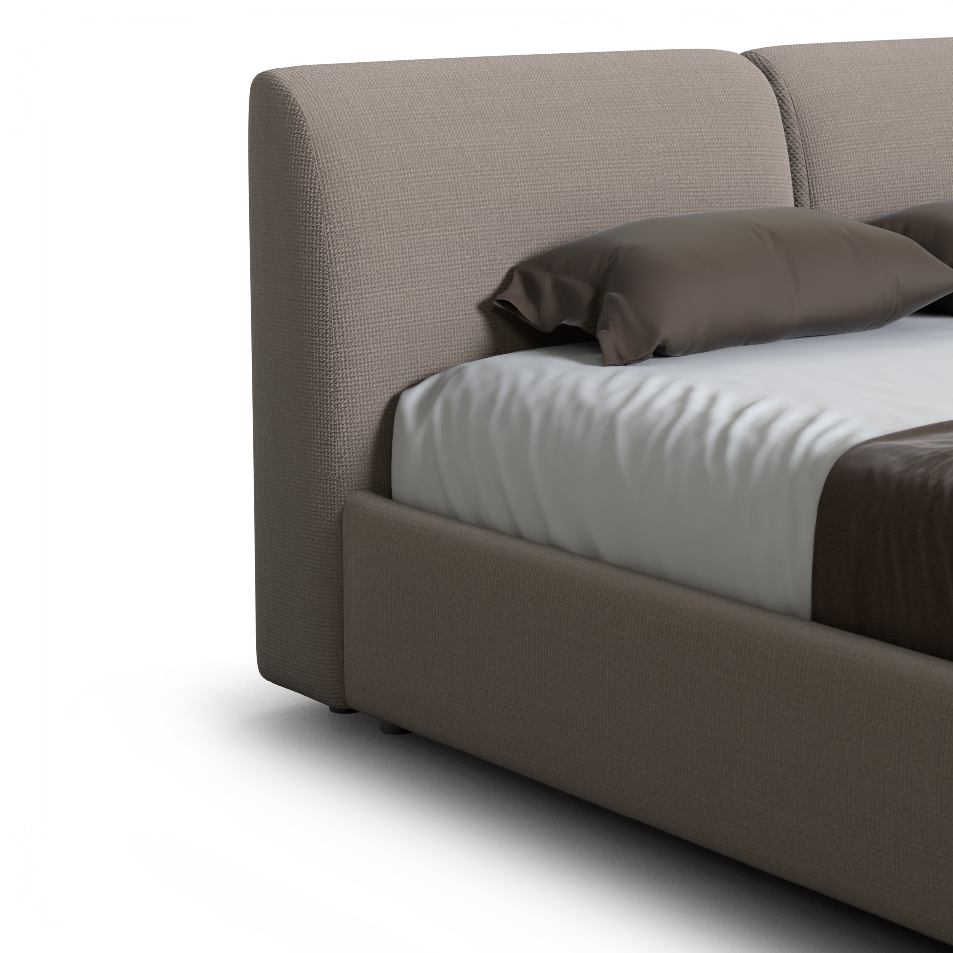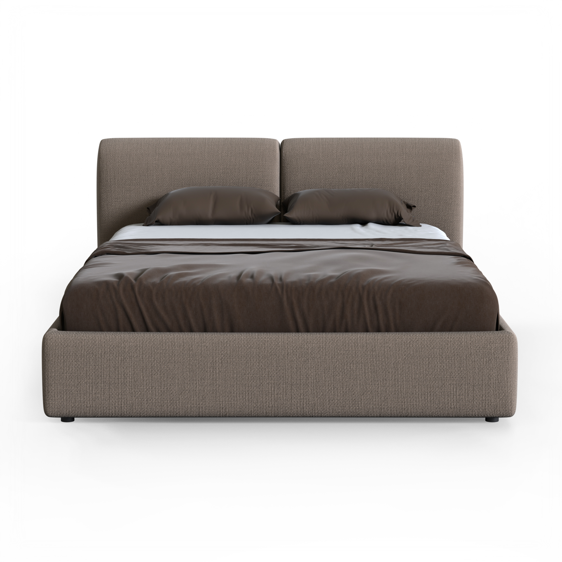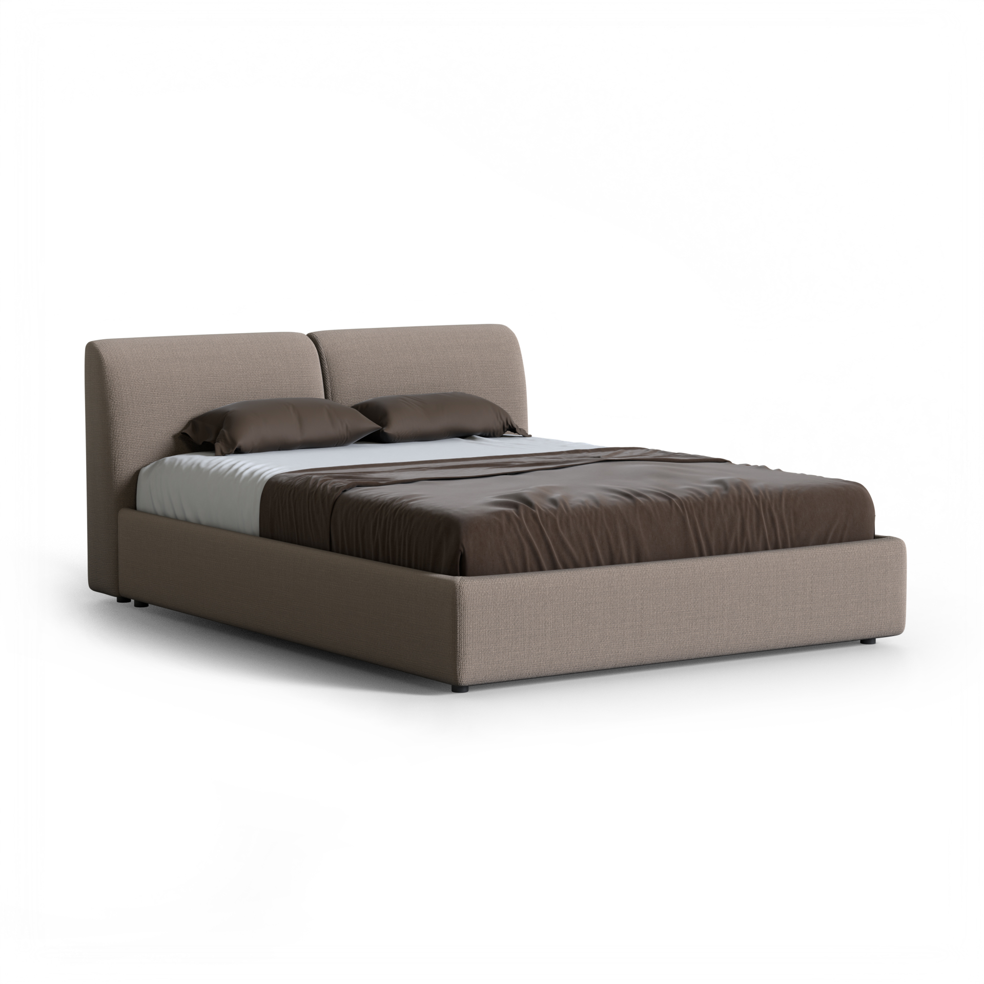 Спальное место 160 × 200 см обеспечивает комфорт для двоих, оставаясь при этом лаконичным по размерам и подходящим для большинства спален. Мягкая обивка с текстурой рогожки создаёт тактильный уют и визуальную глубину, делая кровать частью интерьера, а не просто предметом мебели.